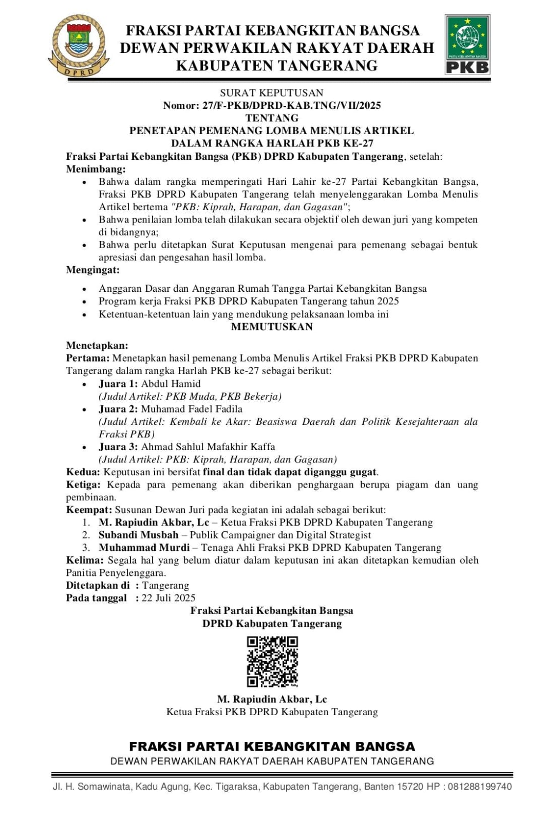 Keputusan pemenang ditetapkan melalui Surat Keputusan Nomor 27/F-PKB/DPRD-KAB.TNG/VII/2025 dan bersifat final. Harapannya, lomba ini bisa menjadi tradisi tahunan yang tak hanya merayakan hari lahir partai, tapi juga menyemai literasi politik yang sehat dan terbuka.